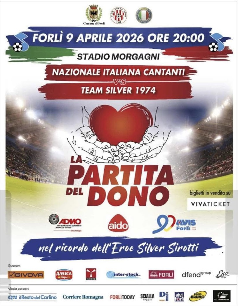 Giovedì 9 aprile alle 20 lo stadio Morgagni ospiterà ‘La partita del dono’ che vedrà la Nazionale Cantanti affrontare una selezione di amici di Sirotti, dove tra i tanti atleti ci saranno rappresentanti del Club Forza Forlì, gli ex calciatori del Forlì Alberto Calderoni, Filippo Valentini e Marco Sozzi, l’ex Cesena e Inter Alessandro Bianchi, il portiere ex Rimini Federico Agliardi, il ciclista forlivese Alessandro Malaguti e tanti altri ospiti non ancora annunciati.